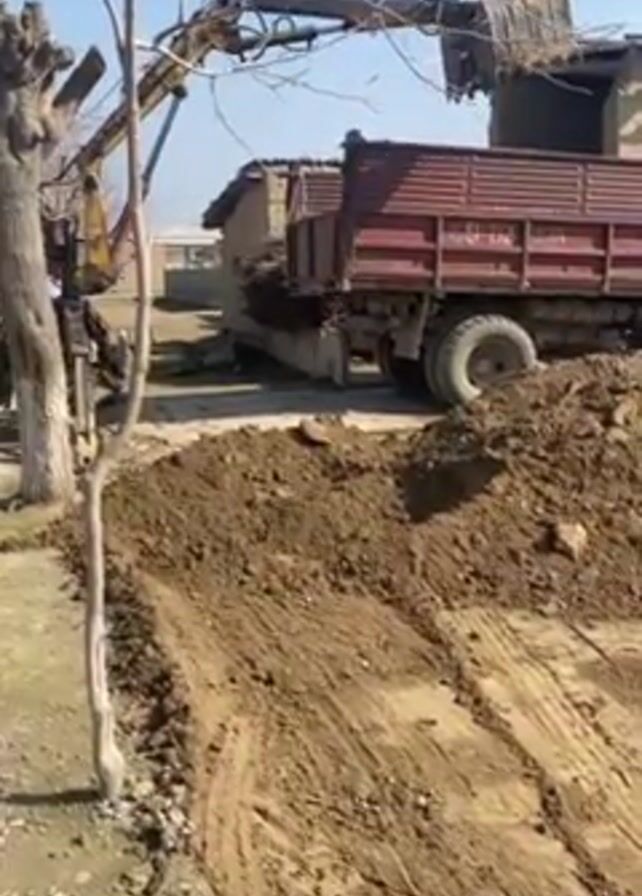 In a daytime outdoor shot, an excavator loads dirt into a burgundy-colored dump truck. The excavator is to the left, positioned behind a small, bare tree, while the truck is on the right. A large pile of dirt sits in the foreground, with fresh tire tracks visible in it. A man in dark clothing walks behind the truck. A small building is visible in the background. The sky is bright blue.
