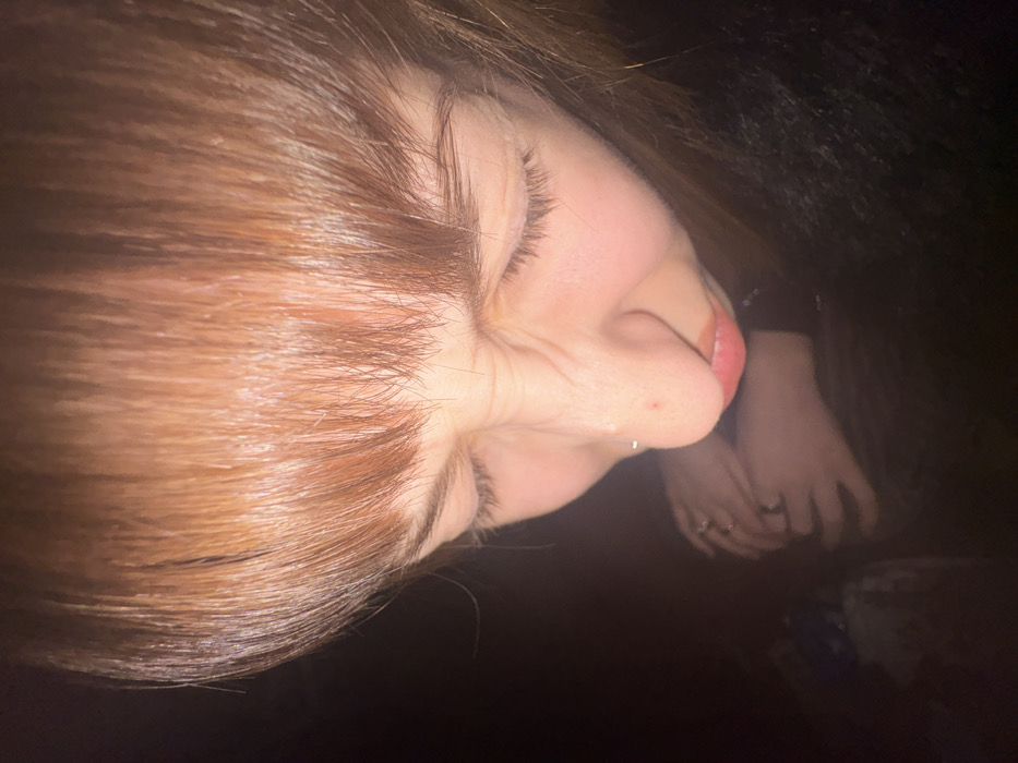 The scene is situated in Stara Zagora, Bulgaria. The image presents a high-angle, close-up view of an individual from the forehead to the lower face and hands, set in a dimly lit environment. The person has reddish-brown hair with bangs covering the forehead. Their eyes are closed or looking downwards, with visible eyelashes. The nose is prominently featured, scrunched and wrinkled, indicating a strong facial expression. A small, shiny metallic piercing is visible on the left nostril, and a dark spot (possible mole or blemish) is present on the bridge of the nose. The lips are slightly parted, revealing a reddish-pink hue. Below the face, two hands are visible, appearing to be loosely clasped or resting together. Multiple rings are worn on at least two fingers of one hand, appearing metallic. The individual is wearing a dark, possibly textured garment, visible on the right side. The background is predominantly dark and out of focus, with a blurry, indistinct light-colored object with blue accents partially visible in the lower-left corner. The lighting is uneven, with a primary light source illuminating the hair and the right side of the face.
