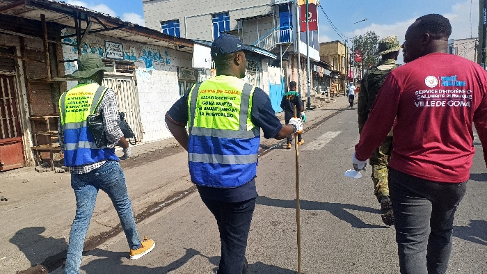 The image displays an outdoor street scene in Rubavu, Rwanda, under a partially cloudy blue sky. Three adult males are prominent in the foreground, viewed from behind, walking along a paved road. The leftmost individual wears a green bucket hat, a plaid shirt, faded blue jeans, and tan shoes. He carries a black shoulder bag and a fluorescent yellow and blue reflective vest. The vest features white French text on the back, partially legible as "CADRE DE GOMA ASSAINISSEMENT GOMA MUPIA..." (Framework of Goma Sanitation New Goma...). He holds a dark object in his right hand. The central individual wears a dark blue cap, a dark shirt, dark pants, and a reflective vest identical to the first, also displaying French text related to Goma sanitation. He holds a long wooden stick in his right hand and wears white gloves. The rightmost individual wears a red long-sleeved shirt with a white logo and text on the back stating "SANTE PUBLIQUE SERVICE D'HYGIENE ET SALUBRITE PUBLIQUE VILLE DE GOMA" (Public Health Public Hygiene and Sanitation Service City of Goma). He wears dark pants and white gloves, holding a small white object in his left hand. Further down the street, an individual in camouflage attire walks in the same direction, followed by other pedestrians. A white pedestrian crossing is visible on the road surface. Buildings line both sides of the street. On the left, structures appear older, with painted and partially faded facades, some featuring corrugated metal awnings. On the right, taller, more modern buildings with blue-tinted windows are present, alongside other commercial establishments. Long shadows are cast on the street from the figures and structures. The attire and signage on the individuals indicate a public health or sanitation initiative, specifically associated with the city of Goma, taking place in the cross-border location of Rubavu.