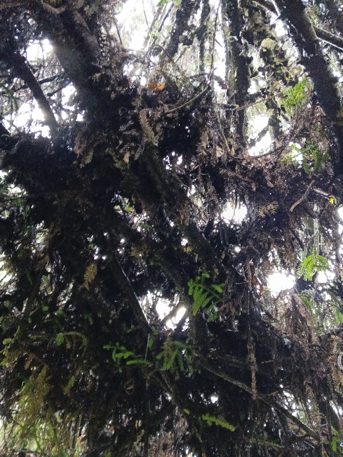 A dense canopy of intertwined tree branches fills the frame, shot from a low angle. Moss and lichen cover the dark branches, creating a textured, damp atmosphere. Sparse green needles offer a stark contrast. Light struggles to penetrate the thick foliage, creating a muted, overcast feel. The close proximity and upward angle highlight the complexity and abundance of the forest ecosystem.