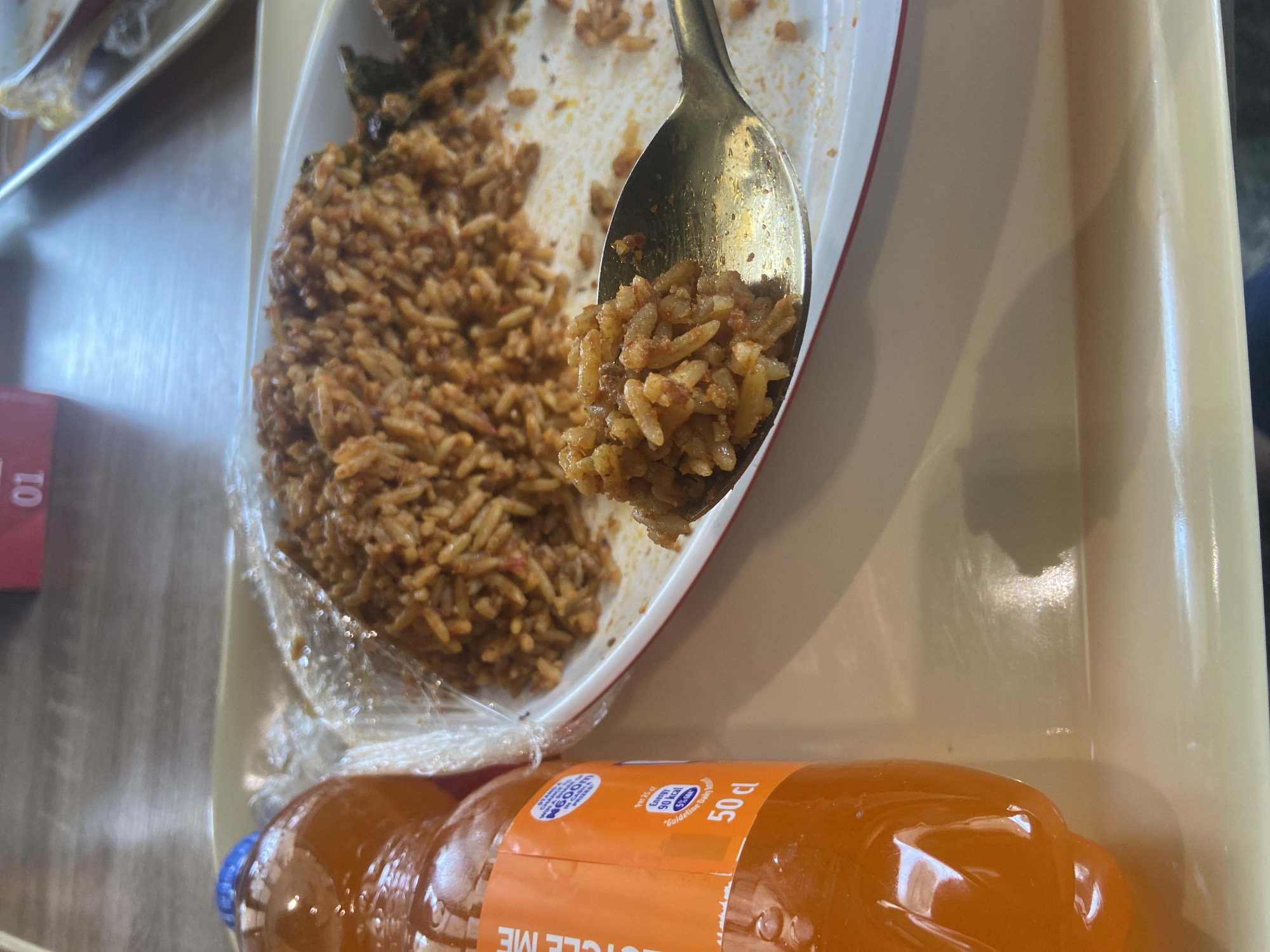 The image presents a forensic view of a meal consumed within a cafeteria or food court setting. A light beige serving tray holds a white oval plate with a red rim, containing a portion of Jollof rice. A metallic spoon, likely stainless steel, is captured mid-air, holding a spoonful of the reddish-orange rice above the plate, indicating an active state of consumption. Traces of rice and sauce are visible on the plate, along with a dark green leafy item on the right side of the main rice portion. To the left, a transparent plastic bottle filled with an orange carbonated beverage, topped with a blue screw cap, rests on the tray. Its label clearly displays "50 cl," "RECYCLE ME," nutritional data including "90 kcal," and a promotional text mentioning "₦600m in cash prizes." The tray sits on a light wooden or laminated table, visible in the background, where a blurry red object with the number "01" is faintly discernible, possibly a table or order number. Another indistinct plate or tray is visible further in the background. Based on the local cuisine (Jollof rice), the Nigerian-specific beverage promotion, and the casual dining environment, the location is most likely a dining hall or cafeteria within the University of Nigeria, Nsukka (UNN).