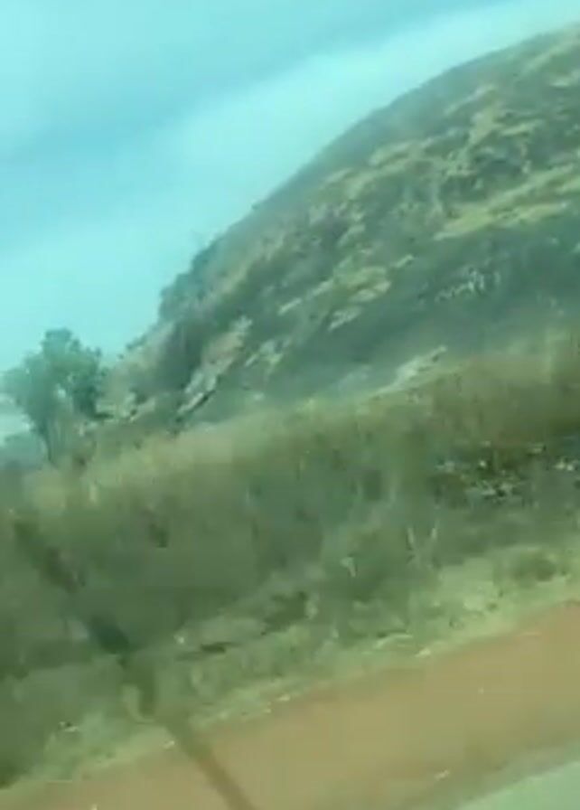 view from inside a moving vehicle, looking out towards a rocky hillside. The hillside is covered in sparse vegetation, mainly grasses and small shrubs. The sky is overcast and a light bluish-green color, possibly due to the window tint. The road is visible in the lower right corner of the frame, with a brownish-red surface. The camera appears to be shaky, likely due to the movement of the vehicle.