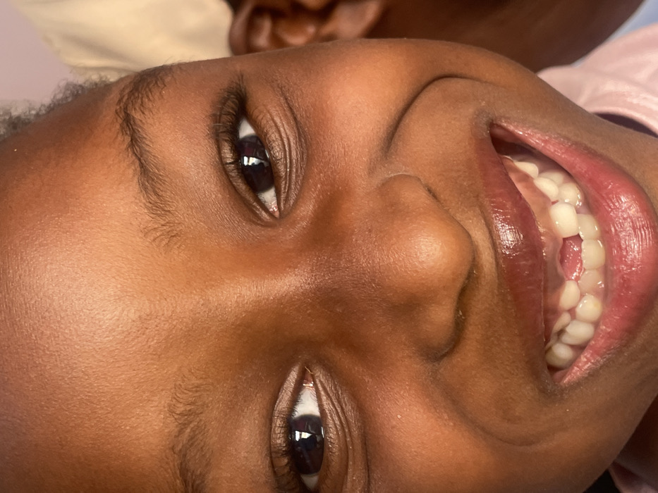 A close-up, high-angle portrait captures the face of a young child, appearing to be of African descent, in what is identified as Barakin Akawo, Nigeria. The child gazes directly at the viewer with wide, dark brown eyes. Both eyes exhibit reflections of a light source. The child displays a broad, open-mouthed smile, revealing a full set of primary teeth in the upper jaw and a gap where a central lower incisor is missing. The lips are full and have a slight sheen. Skin tone is dark brown and appears smooth. Visible on the upper right is a blurry, light-colored object or garment, possibly belonging to another individual partially visible in the background. The child is wearing a light-colored garment, possibly pink, visible on the lower right. The overall background is out of focus and nondescript, suggesting an indoor setting.