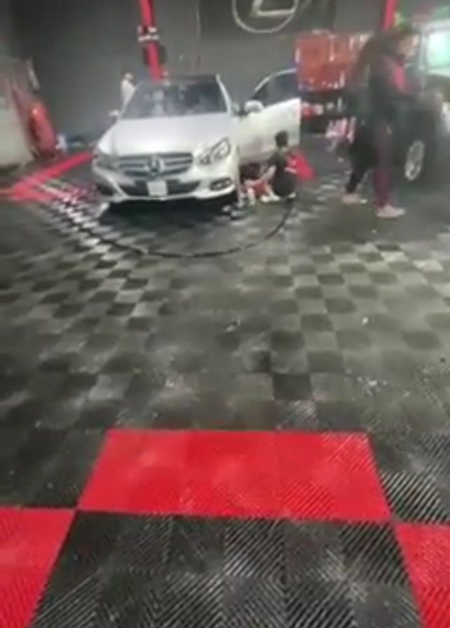 Inside a garage or car wash, a person is cleaning the interior of a silver Mercedes-Benz sedan. The car is covered in soap suds, and the driver's side door is open. Another person stands behind the car, near a dark-colored SUV. The floor is covered in interlocking black and red tiles. A Lexus logo is displayed on the wall in the background.