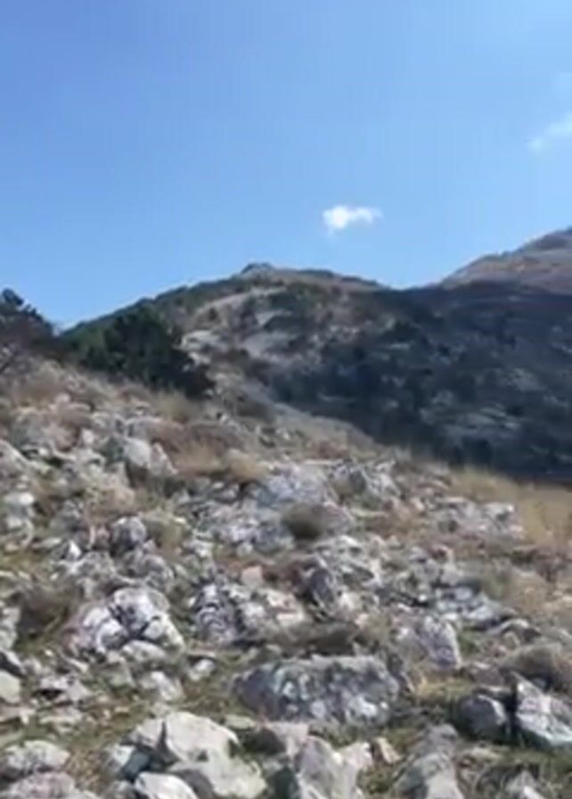 A person wearing a backpack and bright green shorts hikes up a rocky mountain trail on a clear, sunny day with some clouds. The mountainside is covered in rocks and sparse vegetation. The camera pans upwards to show a larger mountain range in the background. The sky is blue.