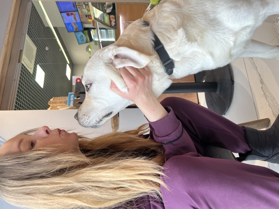 The image depicts an indoor scene within a commercial establishment, likely a quick-service restaurant, located in Mytishchi, Russia. A blonde female, with long hair, is in a crouching position on a light-colored tiled floor. She wears a purple tracksuit with dark trim and black insulated winter boots. Her right hand is placed on the side of a light-colored Labrador Retriever's head, near its ear. Her lips are pursed, directed towards the dog. The dog, wearing a black adjustable collar with a grey buckle, looks upwards towards the woman. A green leash or strap is visible attached to the dog's collar on its right side. A black table with a circular base is situated between the woman and the dog. In the background, through an open service area, a food counter is visible, featuring multiple digital menu screens displaying food items, a refrigerated display case, and condiment dispensers. Overhead, a suspended grid ceiling with square recessed lighting panels and an air vent is present. Partially visible signage with Cyrillic text, including the word "есть" (to eat/there is), and stacked cardboard items are also visible in the background.