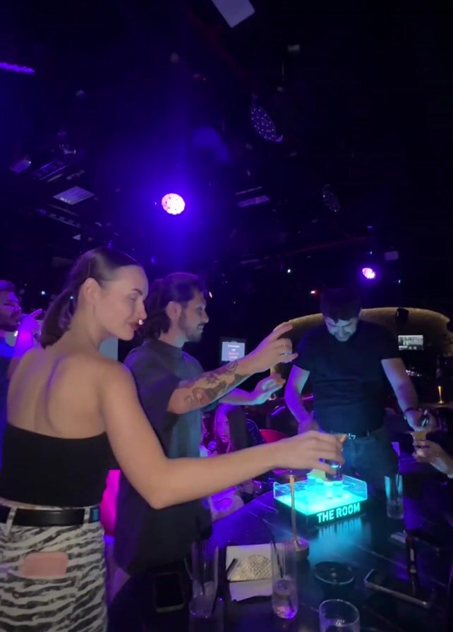 dimly lit nightclub or bar with people gathered around a black table, toasting with glasses. The space has a high ceiling with exposed pipes and lighting rigs, illuminated with violet and blue lights. The focus is on three people at the table: a woman with her hair pulled back, wearing a strapless black top and zebra-striped pants; a man with long hair and a tattoo on his arm, wearing a grey shirt; and a man in a black shirt. In the center of the table is a lighted cube with "THE ROOM" printed on it. There are also several glasses, some filled with liquid, and a phone on the table. The group appears to be in the middle of a toast, raising their glasses towards each other. The background includes other people and glimpses of the rest of the establishment.