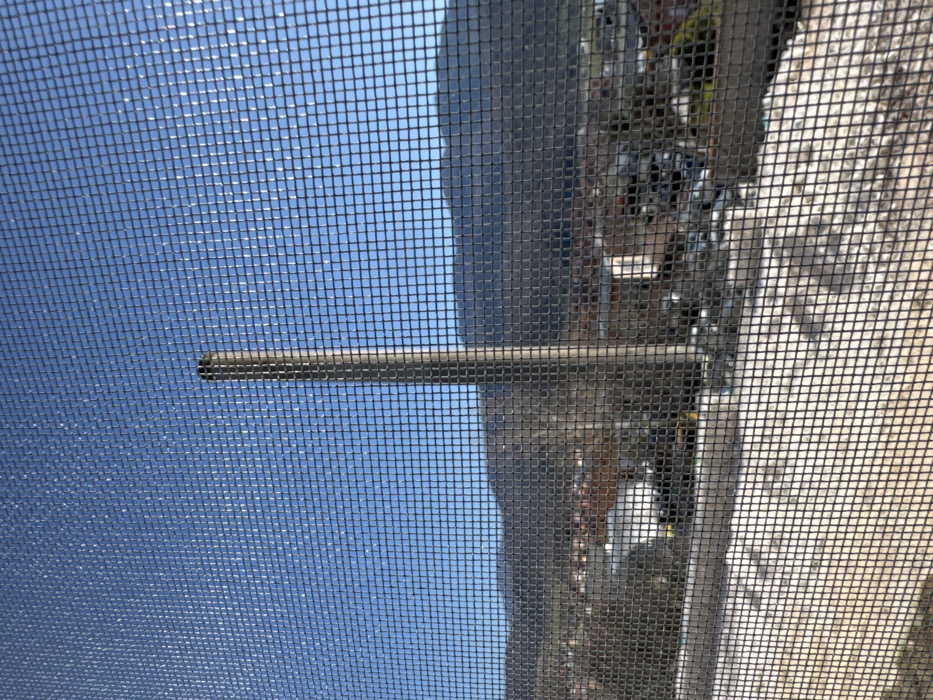 The image displays a daytime view of the city of Peshtera, Bulgaria, as observed through a window screen. The screen's gray, fine mesh is visible across the entire frame, creating a grid pattern and slightly blurring the background elements. The upper portion of the frame features a clear, bright blue sky. Numerous small, reflective glints, consistent with sunlight hitting a metallic or synthetic screen mesh, are scattered across the screen in the sky area. Dominating the central-right aspect of the composition is a tall, slender, cylindrical concrete pillar, likely a chimney or a similar industrial structure, extending vertically from the lower-middle towards the top of the frame, silhouetted against the sky. Below the pillar and the clear sky, the urban landscape of Peshtera unfolds. In the mid-ground, a cluster of residential and commercial buildings with varied architectural styles and reddish-brown tiled roofs is discernible. Streets with parked vehicles, including cars and vans, are partially visible among the structures. Sparse, bare deciduous trees are interspersed throughout the urban fabric and on the lower slopes of the distant mountains. In the background, a series of dark, undulating mountain ranges rise behind the city, their contours partially obscured by the screen and atmospheric haze. The immediate foreground, below the city and the base of the pillar, consists of a horizontal surface partially covered with a patchy layer of dirty snow or light-colored gravel, also viewed through the screen. No people, discernible actions, or direct interactions are visible within the frame. The scene is brightly illuminated by direct sunlight.