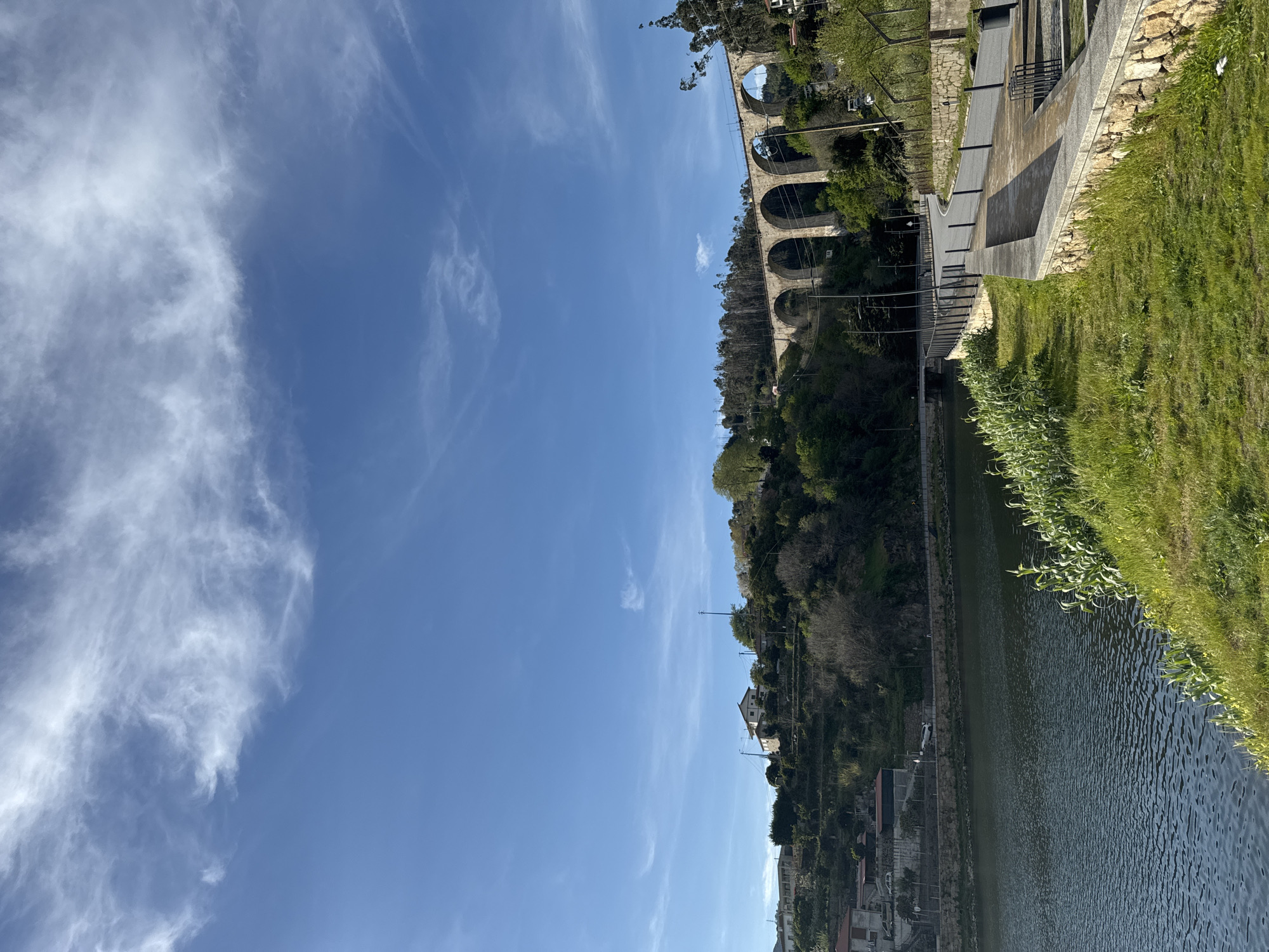 The image depicts a landscape in Baião, Portugal, featuring a body of water, possibly the Douro River, to the right of the frame. Along the riverbank, there is a green grassy area and a modern pathway with concrete barriers. Above the pathway, an aqueduct with multiple arches rises amidst dense trees and vegetation. Further up the hillside, there are scattered houses and buildings. The sky is predominantly blue with streaks of cirrus clouds. The orientation of the image is vertical.