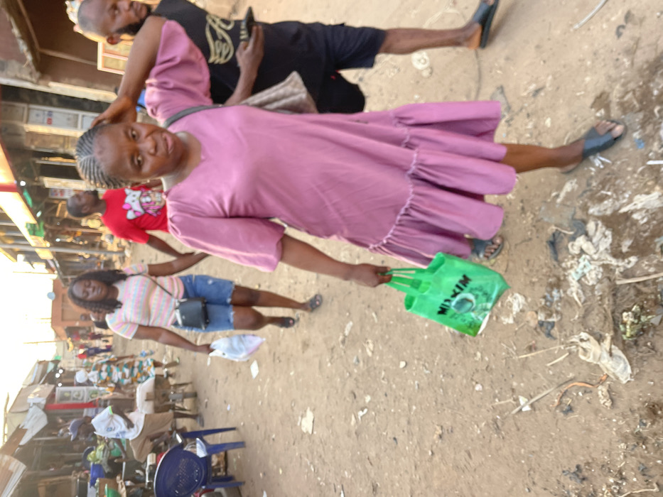 A woman in a pink dress stands in a bustling outdoor market. She holds a green shopping bag with the word "NIXIM" printed on it. Behind her, another woman wears a striped shirt and denim shorts. A man with a beard and a black shirt is partially visible in the background. The market is crowded, with people, stalls, and various objects scattered around. The ground appears to be dirt or sand.