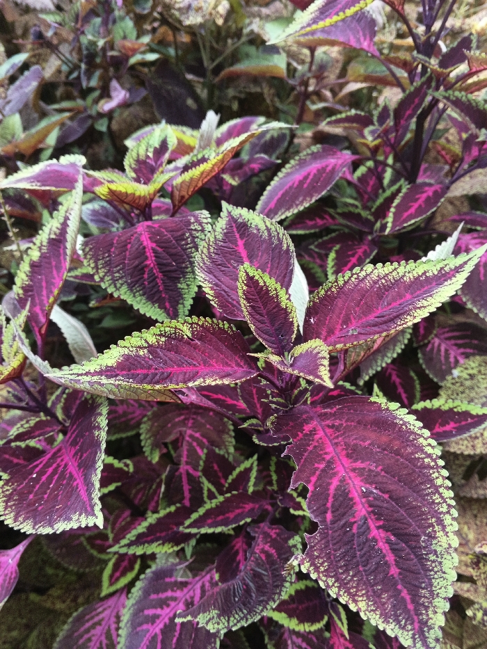 A vibrant cluster of Coleus plants fills the frame. Their leaves, predominantly burgundy and magenta, showcase striking patterns of veins. Each leaf edge is trimmed with a textured band of lime green. The leaves have a serrated edge, some with minor damage. These plants create a dense and colorful display.