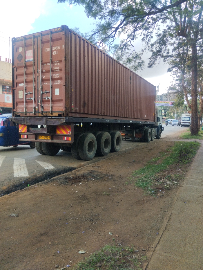 The scene depicts a brown, weathered shipping container mounted on a multi-axle semi-trailer truck, situated on a road in Thika Township ward, Kenya