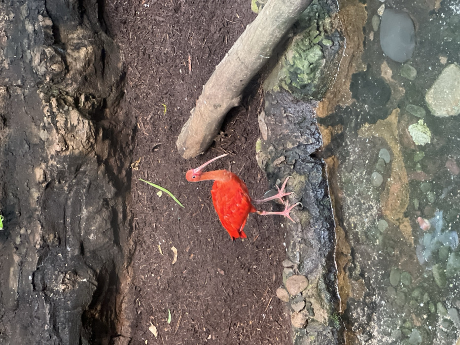 - "An overhead shot shows a vibrant scarlet ibis standing on brown ground beside a rocky, water-filled edge" by FM-8yKDv2, licensed under CC BY 4.0