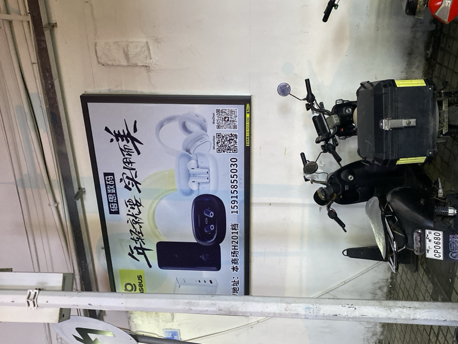 The scene depicts an urban outdoor environment, likely a commercial area within Yuexiu District, China. A prominent rectangular advertisement billboard for "Baseus Digital" is mounted on a light-colored, worn wall in the mid-ground. The billboard features the text "年轻就要 实用而美" (Young people need to be practical and beautiful) and displays images of a black power bank, a black wireless earbud case, an open white wireless earbud case with earbuds, and white over-ear headphones. Below the product images, contact information states "/地址: 本商场H201档 15915855030" (Address: This mall H201 booth 15915855030) and includes QR codes for WhatsApp and WeChat. A grey utility pole occupies the left side of the frame, partially obscuring the billboard's left edge. A blurred green and white street sign, displaying the character "街" (Jie - street), is attached to this pole. In the foreground, parked on a dark-tiled ground, are at least two scooters. The leftmost scooter is black with a silver seat and a rear rack; its license plate reads "CP0680". Behind it, a black conical object is visible. The central scooter is also dark-colored, featuring a large, rectangular black storage box on its rear equipped with yellow reflective strips. Part of a third, red and black vehicle is visible on the far right. No people are present in the image. The environment appears to be under artificial illumination, casting subtle shadows.