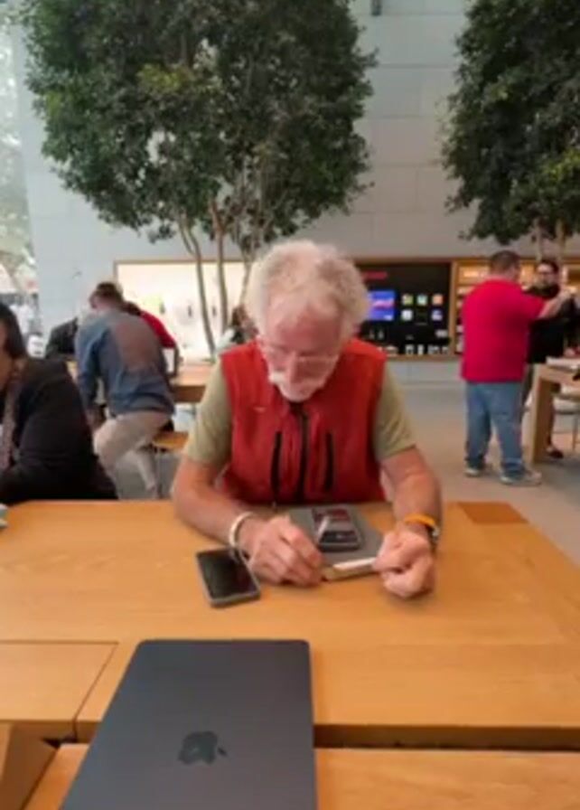 An elderly man with gray hair, wearing an orange vest over a light green shirt, is seated at a wooden table in an Apple store