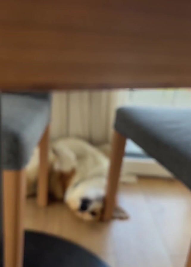 A low-angle, static, eye-level shot reveals a light-colored, wood-floored room with a table and chairs. A beige and white Corgi dog lies on its back, head resting against a table leg. The dog appears to be asleep or very relaxed. There are two chairs with gray cushions positioned at the table. A window with a balcony is visible in the background. The lighting is soft, suggesting daylight. The camera focuses on the dog under the table, starting with a view of the table's edge and then tilting down to reveal the dog.