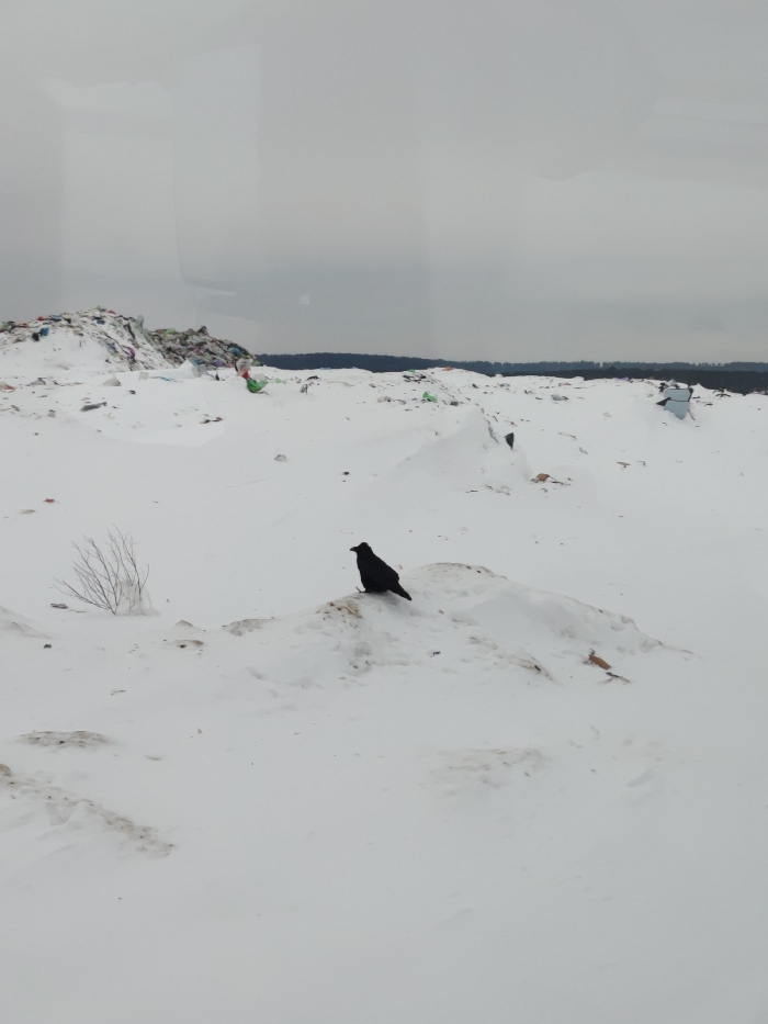 The scene depicts a snow-covered landfill or refuse site under an overcast sky, likely in or near the city of Svetlyi, Russia. In the foreground, a single black bird, consistent with a crow or raven, stands prominently on a small mound of snow and dirt. To the left of the bird, a sparse, bare shrub emerges from the snow. The mid-ground and background are dominated by extensive snowfields, irregularly shaped and interspersed with visible refuse. To the far left, a large, multi-colored pile of garbage, including various plastics, is partially obscured by snow. Scattered debris, such as green plastic bags and other refuse fragments, is visible across the snow-covered landscape. A dark, distant treeline forms the horizon beneath a uniform grey sky, suggesting a cold, wintry environment. No human figures are present.