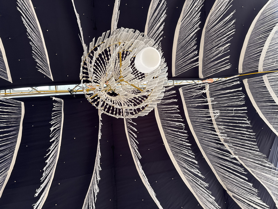 A low-angle shot showcases a black fabric ceiling adorned with curvilinear designs of white fabric strips ending in frayed strands