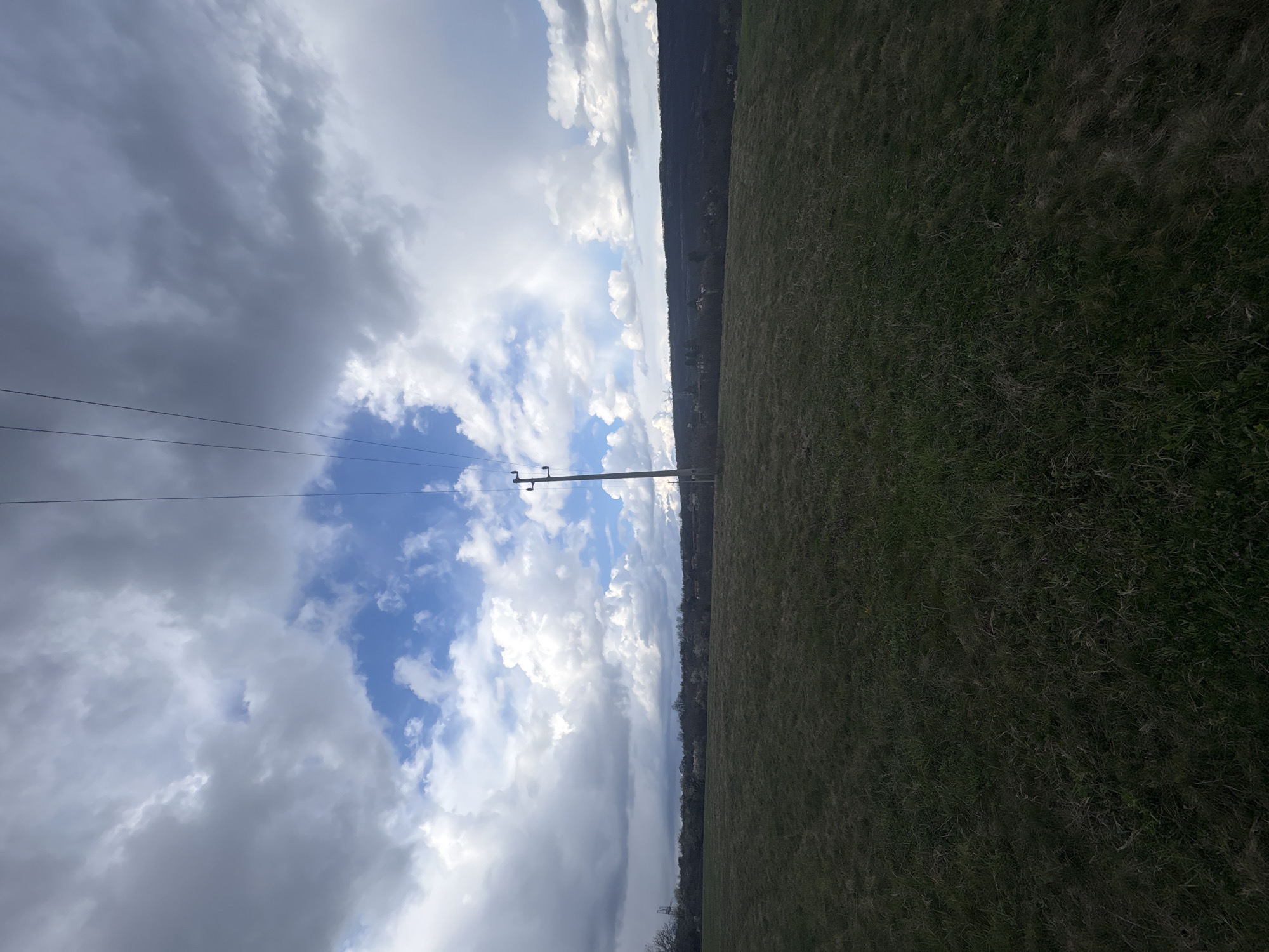 The image depicts an expansive rural landscape in Katrandjii, Bulgaria, under a dynamic sky. The foreground consists of a broad, undulating field of dark green and brown grass, showing patches of dry and new growth. Approximately one-third of the way into the frame from the bottom, a single, tall wooden utility pole stands vertically, centrally positioned. Multiple thin, dark wires extend diagonally upwards and left from the top of this pole. The sky above is characterized by a dramatic contrast: heavy, dark grey storm clouds dominate most of the upper frame, but a distinct patch of bright blue sky with scattered white cumulus clouds is visible directly above and slightly to the left of the utility pole. In the midground, a distant treeline, appearing as a mix of leafless and blossoming deciduous trees and some evergreens, stretches horizontally. Beyond this, in the far background on the right, dark, forested hills or mountains are visible. No human figures or discernible structures beyond the utility pole are present within the immediate scene. The overall lighting suggests daylight, possibly under shifting weather conditions.