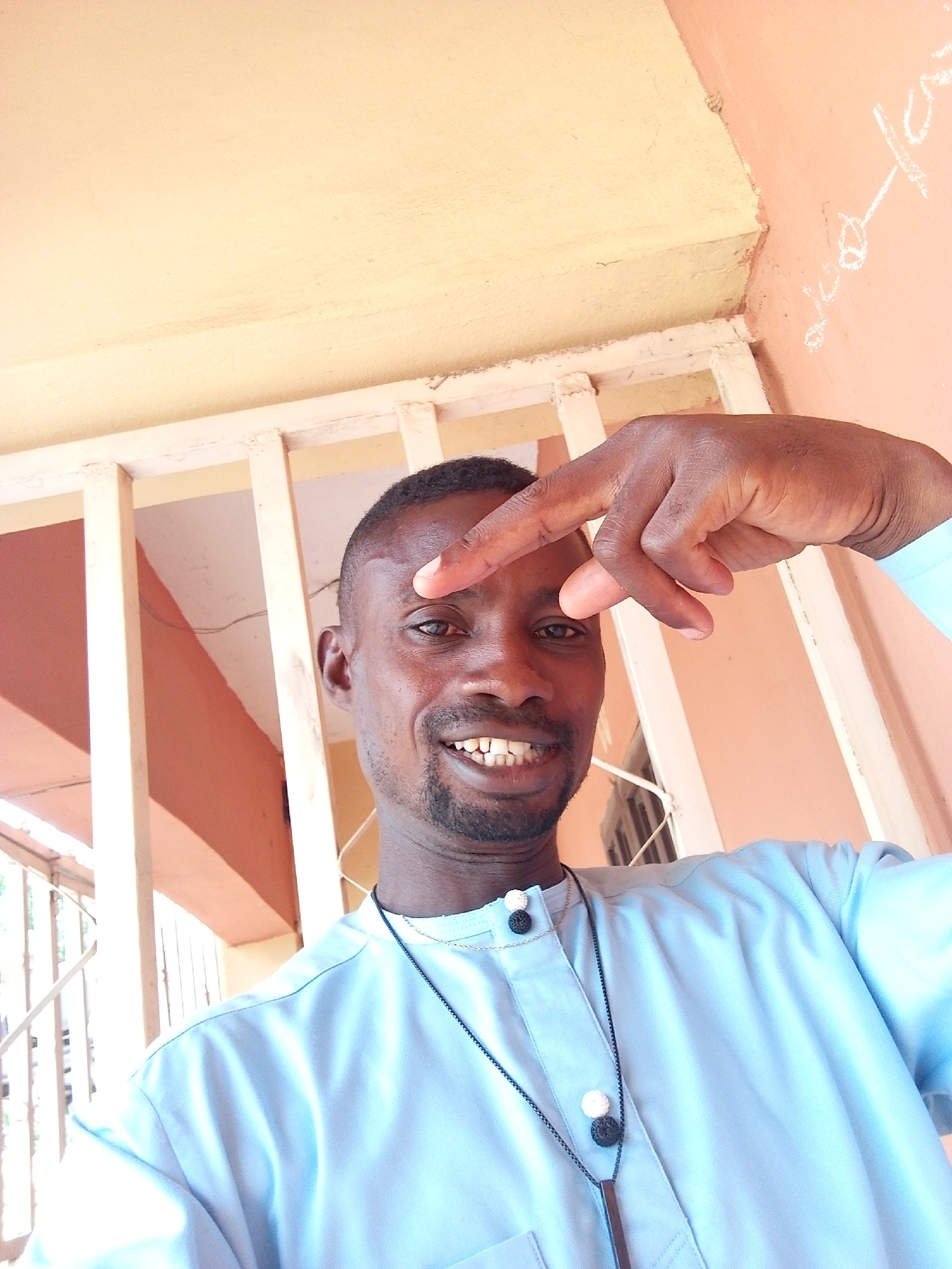 A man in Otokiti, Nigeria is posing for a selfie. He is of African descent with short black hair and a trimmed beard. He is wearing a light blue, collared shirt with decorative buttons and a long pendant necklace. The man is smiling and making a hand gesture near his forehead. Behind him, there is a metal gate and a peach-colored wall. Writing is visible on the wall. The environment appears to be outdoors, possibly on a porch or balcony.