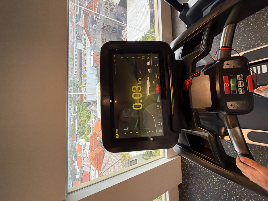 A treadmill screen displays "0.03 km" distance. The control panel has start and stop buttons along with speed and incline adjustments. A red sensor and wiring are connected to the panel. The background shows a cityscape visible through a large window. The treadmill is on a black rubber floor and the overall view is from a slightly elevated, angled perspective. Hands are resting on the treadmill handles.