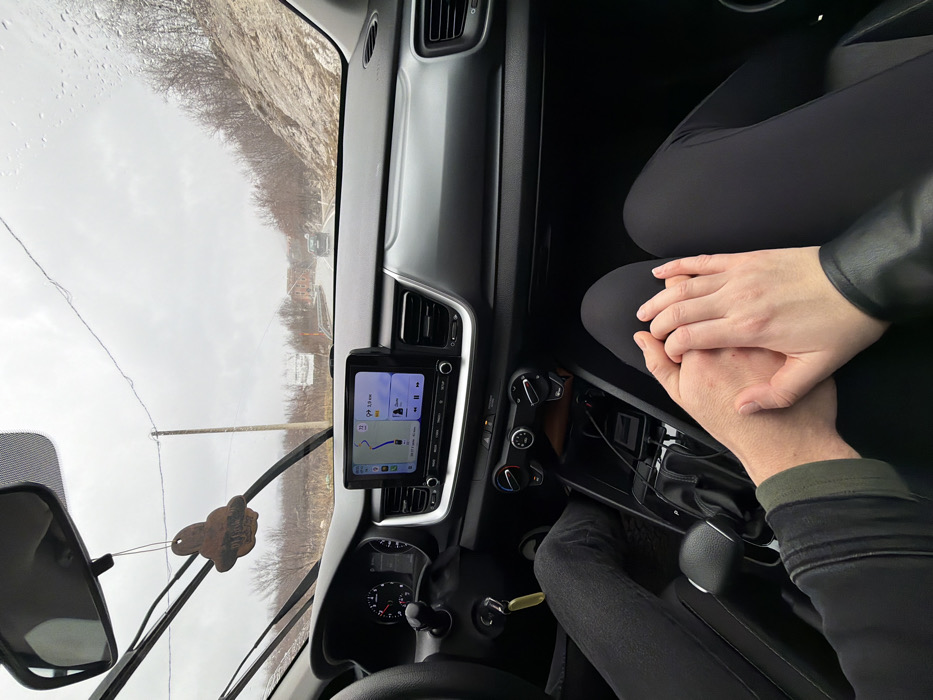 Inside a car, the interior is visible, with a dashboard featuring a navigation screen displaying a map and route