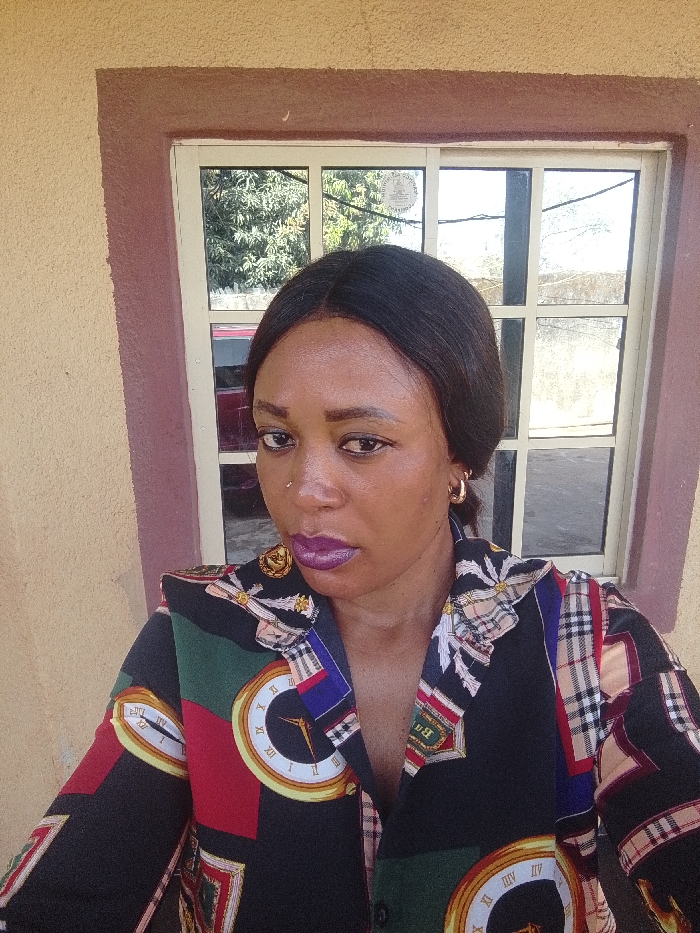 A photograph depicts a woman positioned in front of a window and an exterior wall, likely located in Sabon Tasha, Nigeria