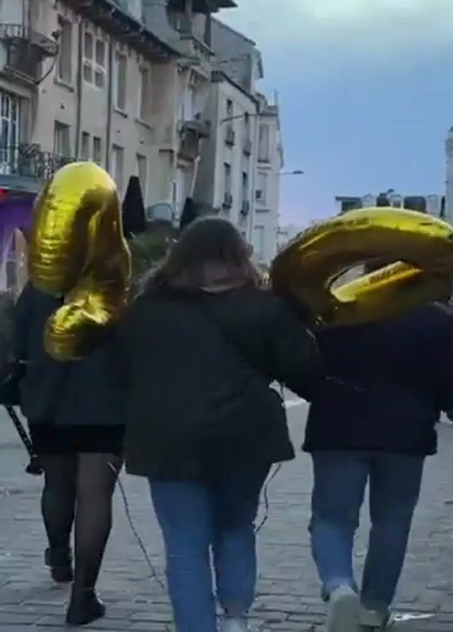 Three people walk away from the camera on a cobblestone street. Two people carry large gold number-shaped balloons. The numbers appear to be "2" and "0". They walk along the side of a building with a restaurant with outdoor seating. Other people walk in the opposite direction. The sky is overcast.