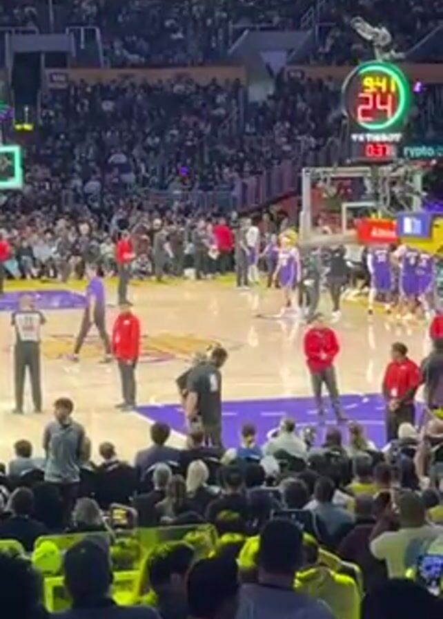 basketball court at a professional game. The teams are visible on the court, along with officials in black and white striped shirts, and other personnel in red jackets. There are a lot of spectators in the seats around the court. The scoreboard shows the time and score. Someone in the front row is recording with a phone. The lights are bright. The scene looks like a break in the game.