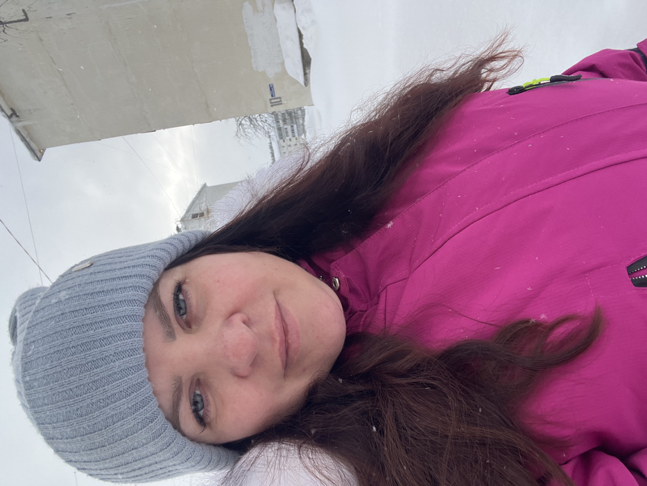 An adult female is depicted in a close-up, chest-up shot in Noviy, Russia, during winter