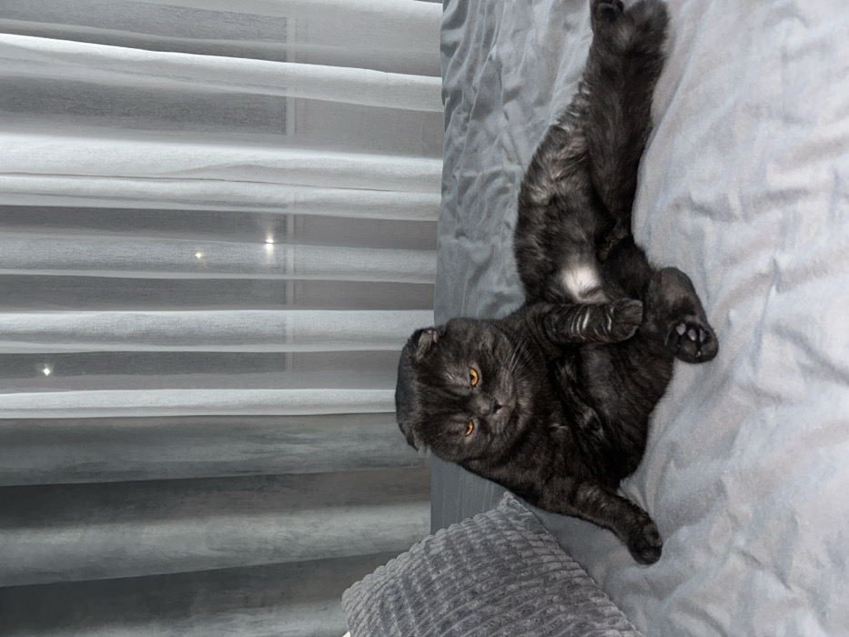 - "An indoor scene in Dobrich, Bulgaria, displays a dark-furred Scottish Fold cat lounging on a grey-sheeted bed" by FM-Wzjle2, licensed under CC BY 4.0