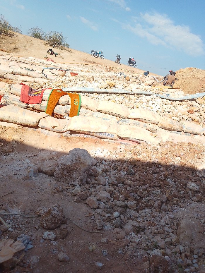 The image displays an arid, outdoor construction or excavation site on a hillside in Reifild-Ist, Nigeria, under a clear blue sky with some scattered white clouds. The foreground consists of loose, light brown soil and numerous rocks. A shadowed area is present in the lower left, where a crumpled light-colored plastic bag is also visible. In the midground, a series of terraced retaining walls are constructed from stacked, light beige sandbags, some marked with "CEMENT" and "ASH" branding. A red garment and an orange-brown garment with green trim are draped over the sandbags. A horizontal blue-grey pipe runs along the slope, positioned behind the sandbags. The background features a steep, unpaved light brown slope with minimal, sparse green vegetation on the upper left. Several individuals are present on the hillside. On the right side of the slope, two individuals are crouched near a mound of darker earth; one is wearing a brown top. Further left and higher on the slope, a third individual in dark clothing is observed. Three motorcycles are parked on the slope, oriented towards the left; one is distinctly light blue and white. The scene is illuminated by direct sunlight, creating defined shadows.