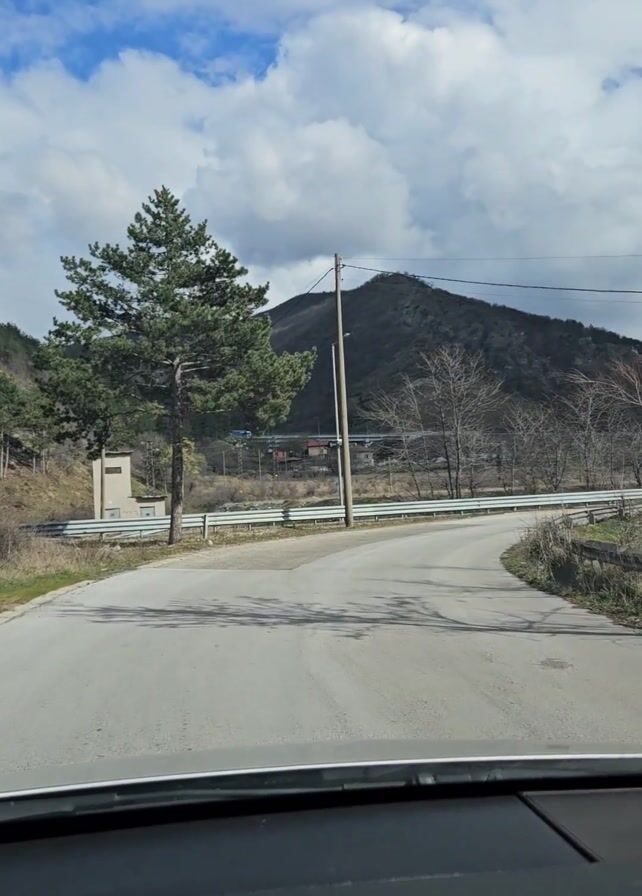 A car driving on a paved road with a mountain in the background. There are trees and telephone poles along the side of the road. The sky is blue with scattered clouds. The road appears to curve gently to the right. The view is from inside the car, looking out through the windshield.