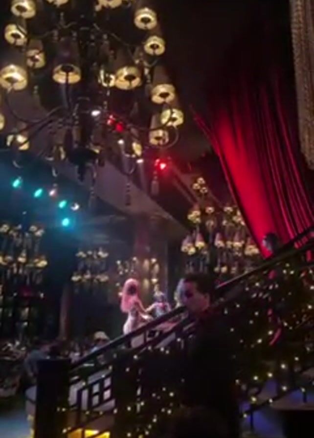 The video captures a vibrant performance scene inside a luxurious establishment. A performer with pink hair and an elaborately patterned outfit dances on a raised platform, bathed in colorful stage lighting. The venue is adorned with multiple chandeliers, adding to the ornate atmosphere. Red drapery accentuates the back wall of the staircase. Patrons stand or sit along the railings, observing the show. A man in a suit is near the staircase. The lights twinkle on the staircase and balustrades.