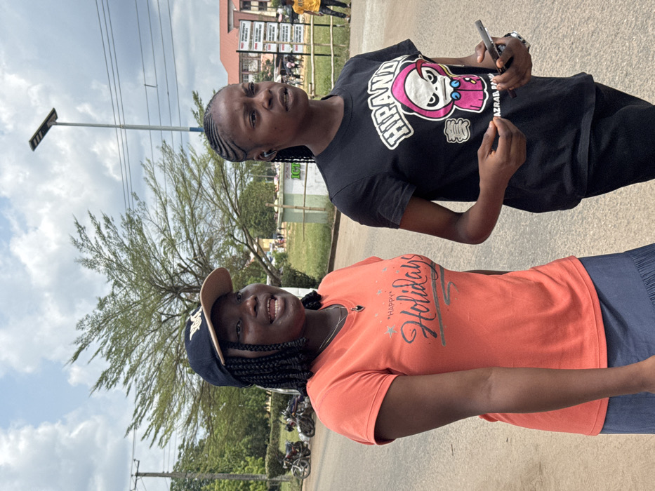Two young adult Black females stand on an asphalt road in Ihiagwa, Nigeria, under a partially cloudy sky