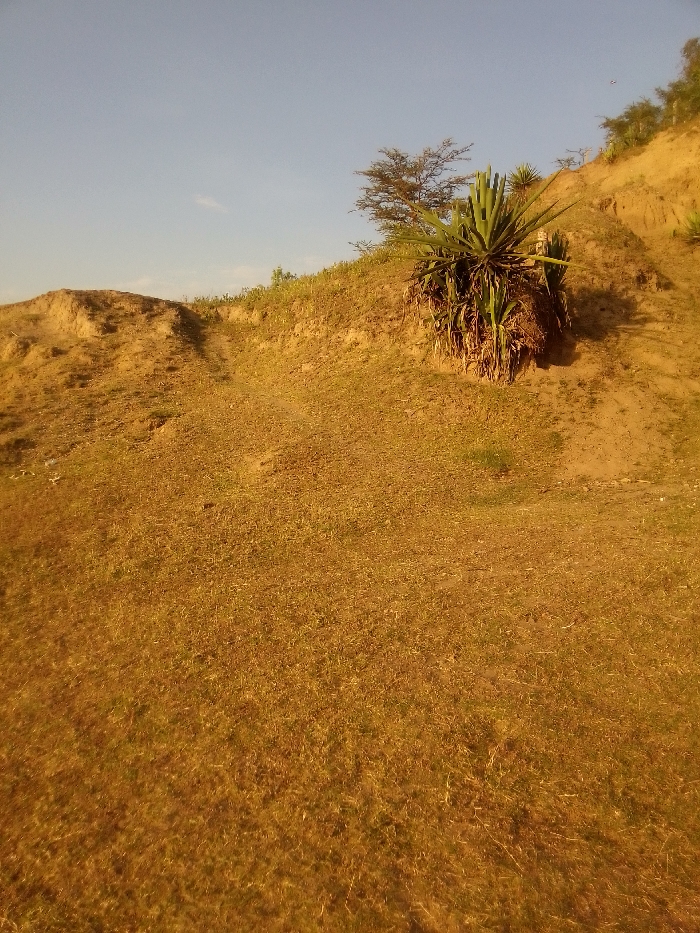 The image portrays an arid, sloping landscape in Central ward, Kenya, under a clear, pale blue sky. The foreground and mid-ground are covered by sparse, dry, yellowish-brown grass intermixed with exposed, sandy-brown earth. A prominent, steep embankment of reddish-brown soil rises diagonally from the mid-ground towards the upper right. Rooted into this embankment, slightly right of center, is a large, multi-leafed, green spiky plant, resembling a sisal or agave, which casts a shadow to its immediate left. Further up the slope and to the left of this plant, a sparse tree with thin, bare branches stands against the sky. The upper crest of the embankment exhibits scattered patches of green vegetation. Faint, worn depressions consistent with a narrow path are visible ascending the slope on the left side. No individuals, animals, or artificial structures are present.