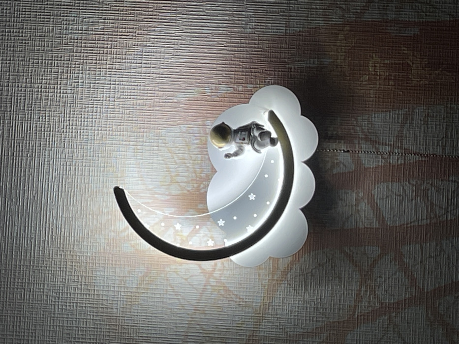 A wall-mounted, illuminated nightlight is centered on a textured wallpaper background within a room in the city of Ново-Никольское, Russia. The nightlight features a white, translucent cloud-shaped base from which a black-edged crescent moon protrudes, illuminated from behind. Small star cutouts are visible on the moon's surface, allowing light to pass through. A small, three-dimensional figure of an astronaut, dressed in a white and grey suit with a golden helmet, is seated on the lower curve of the crescent moon with its right arm raised. A metallic bead chain hangs vertically from the bottom center of the cloud, serving as a pull switch. The wallpaper has a fine, grid-like texture overlaying a faded, abstract pattern resembling tree branches in shades of beige, brown, and grey. The lamp casts a warm, soft glow onto the immediate surrounding wall.