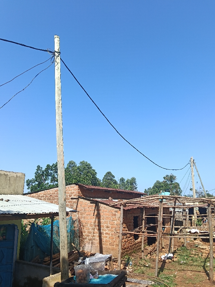 A rural landscape with simple structures made of brick and wood beneath a clear blue sky. Overhead, power lines are strung between weathered wooden poles. One pole stands prominently in the foreground, supporting several lines. Some buildings have corrugated metal roofs, while a partially constructed wooden frame structure sits to the right. The overall scene evokes a sense of simplicity and modest living conditions.