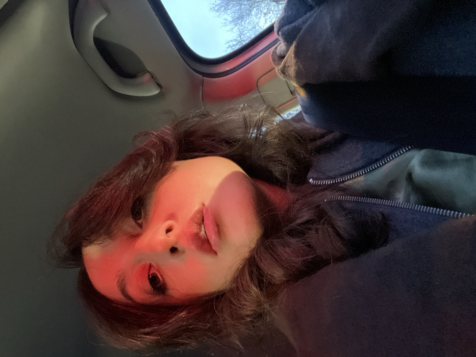 A low-angle shot captures a person indoors, possibly in a car. The individual has dark hair, soft features, and is wearing a zipped-up dark jacket. A handle is visible at the top of the frame, suggesting the interior of a vehicle. The light source gives the skin a reddish tint. Sky and bare branches can be seen through the window.