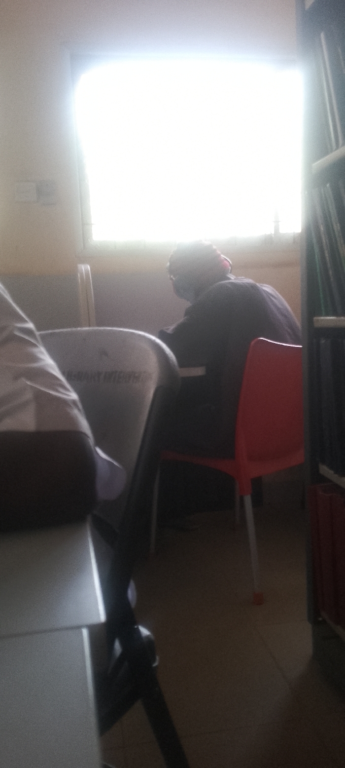 The image depicts an indoor scene in Unknown, Unknown, characterized by severe backlighting from a prominent, undraped window spanning the upper right and central background. In the immediate foreground, to the left, a person is partially visible from the chest down, wearing a light-colored upper garment and dark lower attire, with a light-colored table surface in front of them. In the midground, a second individual is seated at a desk or table with their back to the camera, silhouetted against the bright window. This person wears dark clothing and a red or dark pink head covering. They occupy a red chair with four silver-colored legs. A grey chair is partially visible behind the second person. To the far right, a dark bookshelf filled with books is vertically arrayed. The wall to the left of the window is light-colored and features a small white fixture, possibly a light switch. The floor is tiled with light-colored squares. No direct interaction between the visible individuals is observed; both appear to be independently static or engaged in individual tasks.