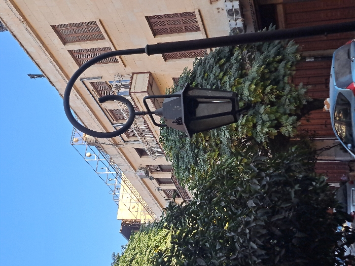 The image displays an urban outdoor scene in the city of Unknown, Unknown, under a clear blue sky. A prominent black, ornate streetlamp with a hexagonal glass lantern fixture stands on the right side. To the left and center, dense green foliage from multiple trees partially obscures the background. Below the trees, a light blue compact car is parked, with a small orange and white cat resting on its roof, facing right. A silver vehicle is partially visible behind the blue car. In the background, a multi-story building constructed from light-colored stone or stucco features several windows with closed brown wooden louvre shutters. An ornate metal-railed balcony is visible on an upper floor, and multiple exterior air conditioning units are mounted on the facade. The rooftop is equipped with metal frameworks and additional structures. No individuals are present in the scene.