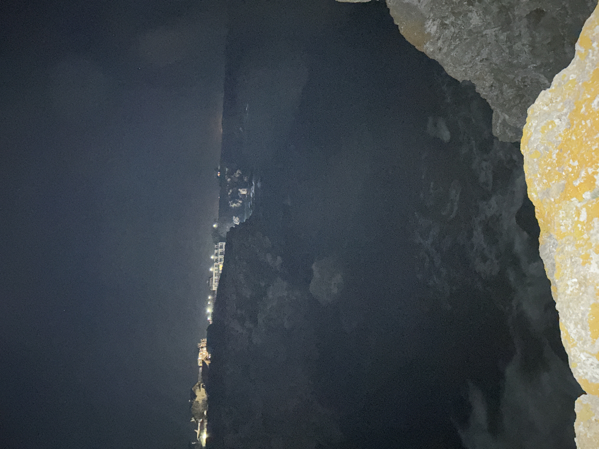 This image presents a nocturnal scene from a rocky vantage point overlooking the Black Sea coastline in Tyulenovo, Bulgaria. The immediate foreground, occupying the lower right and extending across the bottom edge, displays a rugged rock surface primarily light grey with prominent patches of yellow-orange lichen. The midground consists of a vast, dark expanse of water, consistent with the sea at night, exhibiting subtle variations in tone that suggest a textured or moving surface. Along the distant horizon, a collection of buildings or structures are discernible, illuminated by multiple distinct light sources, indicating a settlement or resort complex. The sky above is dark, with minimal visible atmospheric features and scattered faint points of light, potentially stars. No individuals, animals, or explicit actions are present within the frame. The scene is static.