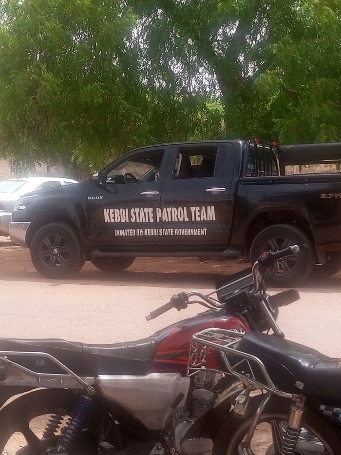 black pickup truck parked on a dirt road. The truck is a Toyota Hilux and has "KEBBI STATE PATROL TEAM" printed on the side, along with "DONATED BY: KEBBI STATE GOVERNMENT." The truck is parked in front of a tree and there is a motorcycle parked in front of it. The location is Gwadan Gaji, Nigeria. The coordinates of the location are: 12.465, 4.252. The motorcycle is red and silver. The truck is in good condition and the motorcycle is in fair condition. The scene is quiet and there are no people in the image. There is a small amount of greenery in the background and a small part of another car is visible.