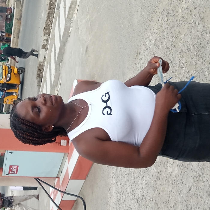 A woman with braided hair wears a white tank top with black letters and dark pants. She holds a small white object with blue cord in her hands. A building with red and white stripes and a light blue section is visible to the left. In the background, a street shows people, a yellow vehicle, and greenery. The image is rotated.