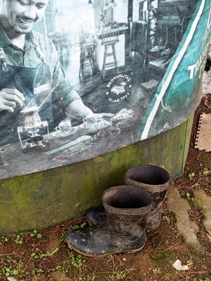 Two dirty black rubber boots sit on a dirt patch under a sign. The sign has a portrait of a smiling man in an apron making coffee with cups of beans. "BERKUALITAS SEJAK 1962" is printed on the sign. The concrete base of the sign is covered in moss. The ground has small plants and twigs.