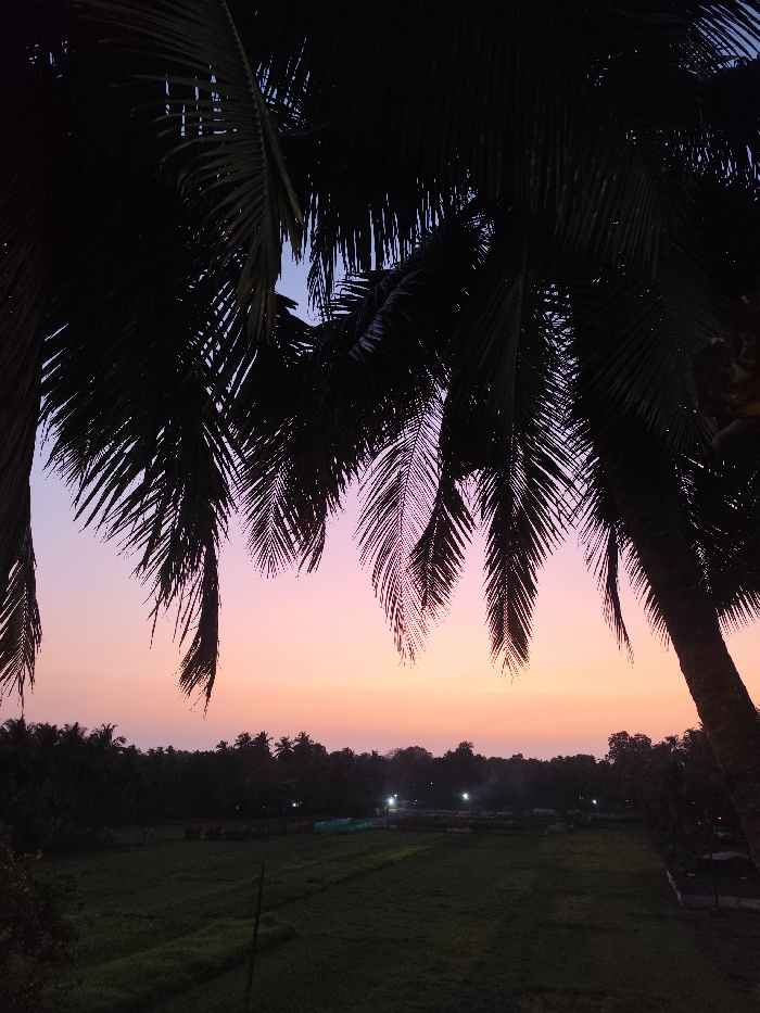 The image depicts an outdoor landscape scene at dusk in Querim, India. The upper third of the frame is filled by the dark silhouettes of numerous palm tree fronds, with a portion of a palm tree trunk visible on the far right. The sky above exhibits a gradient, transitioning from a light blue at the top to hues of pink, orange, and light purple towards the horizon. The lower two-thirds of the image show a dark, flat expanse of land, identifiable as fields, stretching towards the background. A slender, dark vertical pole is present in the lower-left section of these fields. The distant background features a dense, dark line of trees forming the treeline against the horizon. Several distinct artificial lights are visible scattered within this distant tree line and across the landscape. No individuals, specific actions, or interpersonal interactions are present in the frame.