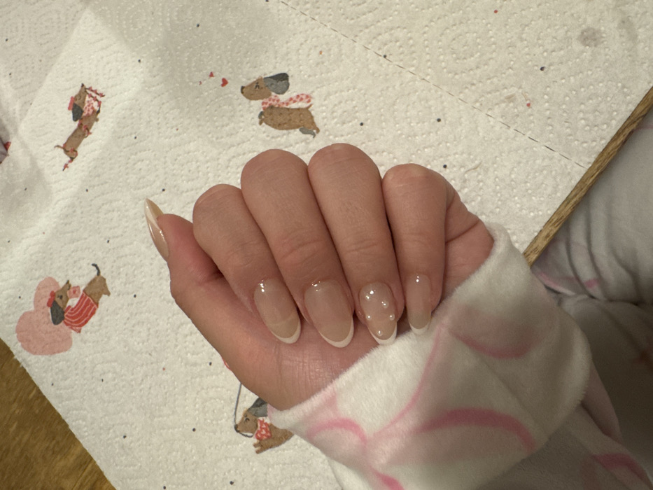 The image depicts a close-up view of a person's left hand, positioned diagonally from the lower left to the upper right. The hand exhibits five fingers with manicured nails, each featuring a French tip design with a clear or nude base and a distinct white crescent tip. The nails are almond-shaped. The ring finger's nail is adorned with three small, clear, spherical embellishments arranged in a triangular pattern near the cuticle. The hand is partially covered at the wrist by a white, soft-textured garment with light pink, swirling patterns. The hand rests upon or is held above a white paper towel. This paper towel has a textured surface and is decorated with repeated illustrations of brown dachshunds in various poses and attire, including some wearing sweaters or scarves, and featuring small heart motifs. A dark wooden surface is visible along the bottom and bottom-right edges of the frame, underneath the paper towel and garment. The specific location within Baden, Austria, cannot be determined from the visual information provided in the image.