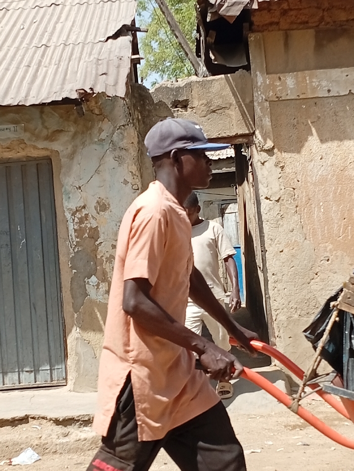 The image captures a daylight street scene in Gwagwarwa, Nigeria, featuring two male individuals and surrounding dilapidated structures. In the foreground, a man with dark skin is depicted in a left profile, walking from left to right. He wears a dark baseball cap with a blue brim, a light orange short-sleeved tunic shirt with side slits, and dark trousers. His hands grip two orange, tubular handles, which are part of an unseen wheeled cart or similar apparatus, partially visible on the right edge. Behind him, another man with dark skin is partially visible, wearing a light-colored shirt and trousers, standing near a doorway. The immediate environment consists of weathered buildings. To the left, a structure features a corrugated metal roof, showing rust and deformation. The wall beneath is light-colored, exhibiting extensive cracks, peeling plaster, and exposed dark substrate. A dark, possibly metal, door with vertical panels is set into this wall. Another structure or wall segment is visible on the right, similarly constructed and exhibiting signs of age and wear. The ground is unpaved, appearing dusty. Bright sunlight illuminates the scene, and fragments of a blue sky with some green foliage are visible above the structures in the background.