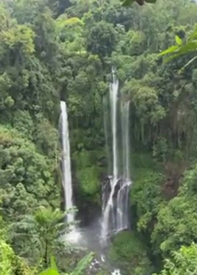 high-angle, static shot of two separate waterfalls cascading down a verdant, tropical hillside. The left waterfall is a single stream, while the one on the right is divided into multiple streams. The surrounding area is densely packed with lush green vegetation, including trees and plants. The sky is overcast, creating soft lighting. The video appears to be shot outdoors in a natural environment.