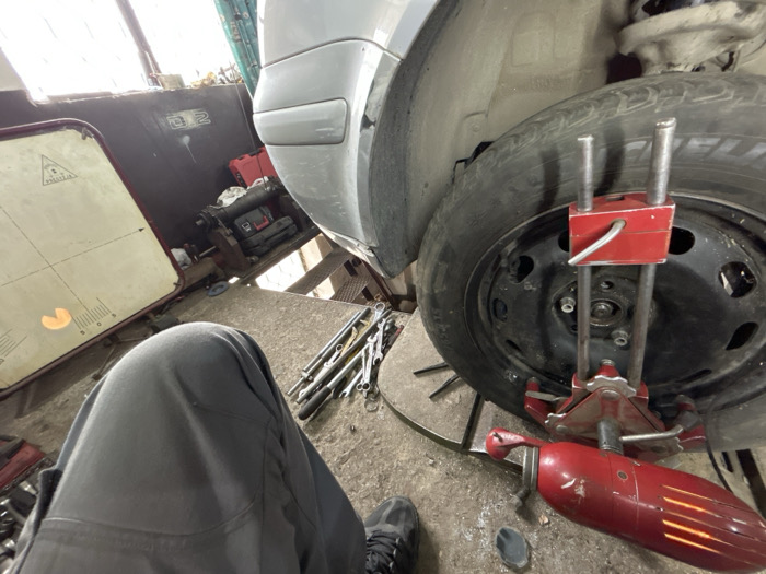 An interior view of an auto repair shop in Lom, Bulgaria, captures a car wheel undergoing alignment or balancing. In the foreground, the legs of a person wearing dark grey work pants and black shoes are visible, positioned as if sitting or crouching. To the right, the front or rear wheel of a silver vehicle, elevated on a lift, is secured by a red measurement apparatus attached to its black steel rim. This apparatus features metallic rods and a red cylindrical base resting on the concrete floor. Scattered on the concrete floor between the person and the wheel are various hand tools, including wrenches and sockets. In the background to the left, a large, light-colored target board, part of a wheel alignment system, stands upright, displaying grid lines and an illuminated orange-yellow target indicator. Behind this board, a dark wall bears faint markings, including "D2". Overhead natural light enters from the upper left, illuminating the scene.